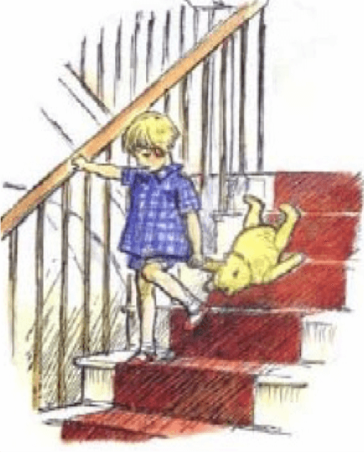 “Here comes Edward Bear now, down the stairs behind Christopher Robin. Bump! Bump! Bump! on the back of his head. It is, as far as he knows, the only way of coming down stairs. He is sure that there must be a better way, if only he could stop bumping for a moment to think of it.”